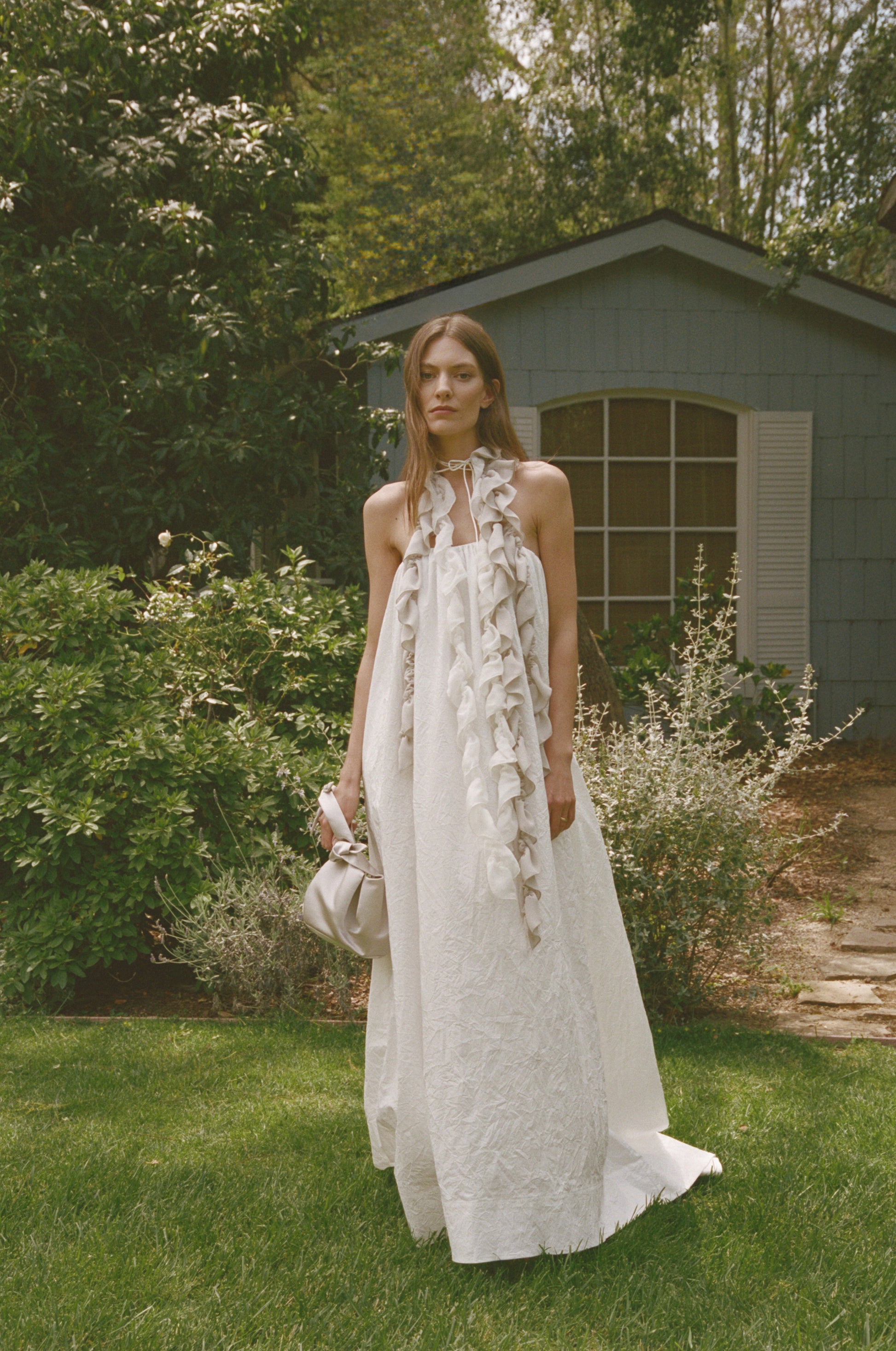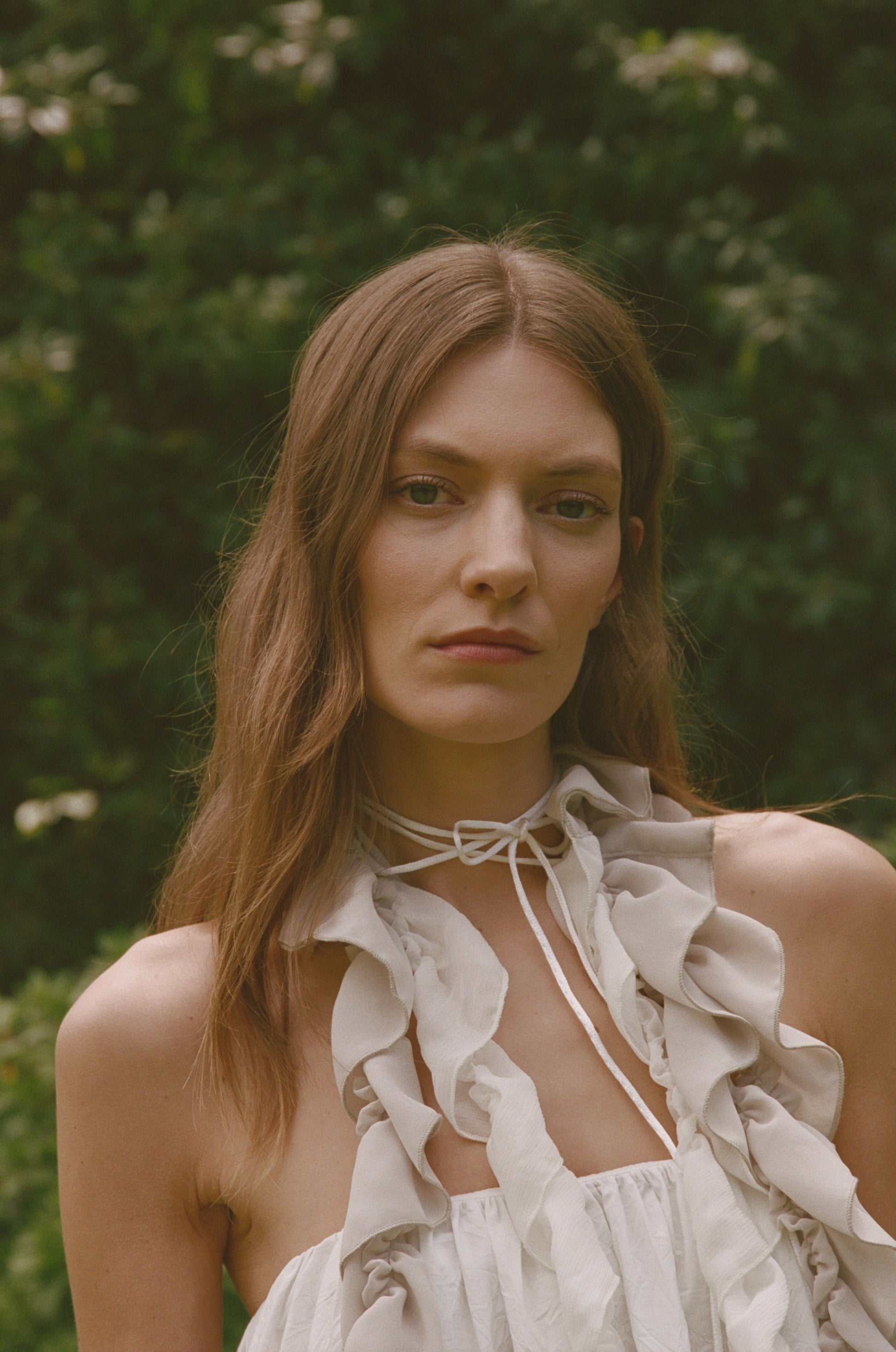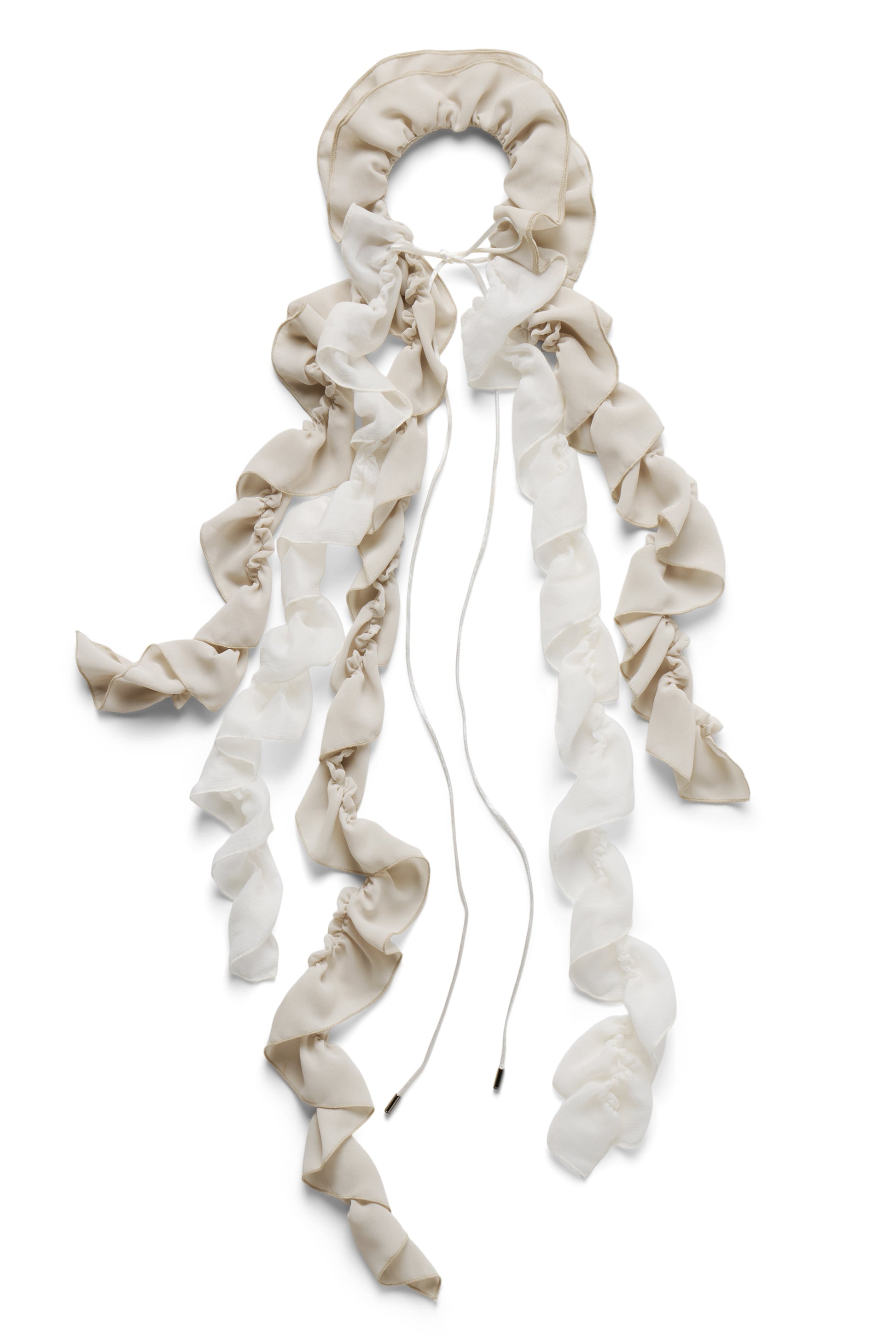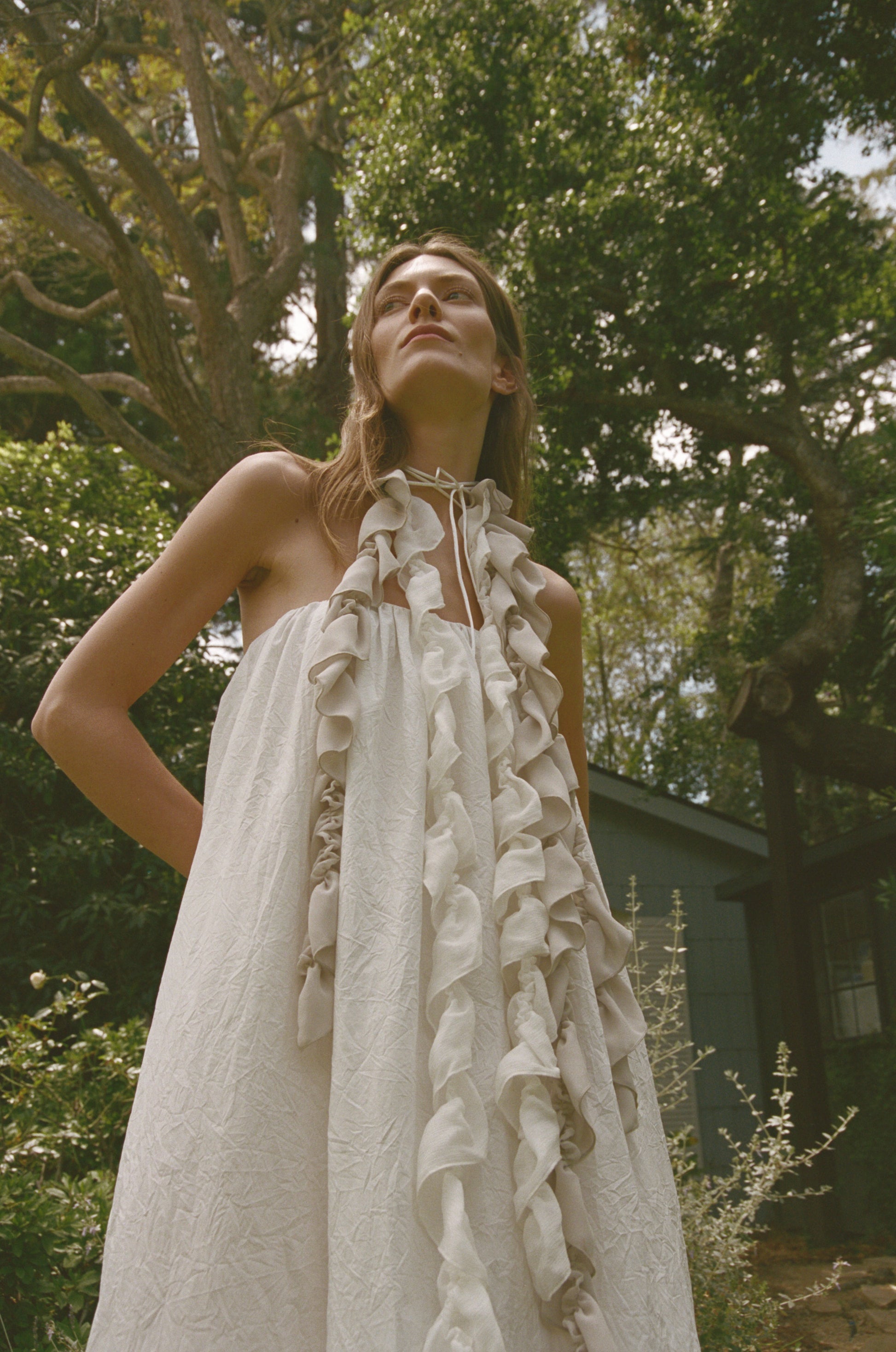 Draped layers of ethereal chiffon crafted from deadstock fabric with an adjustable tie at the neck.